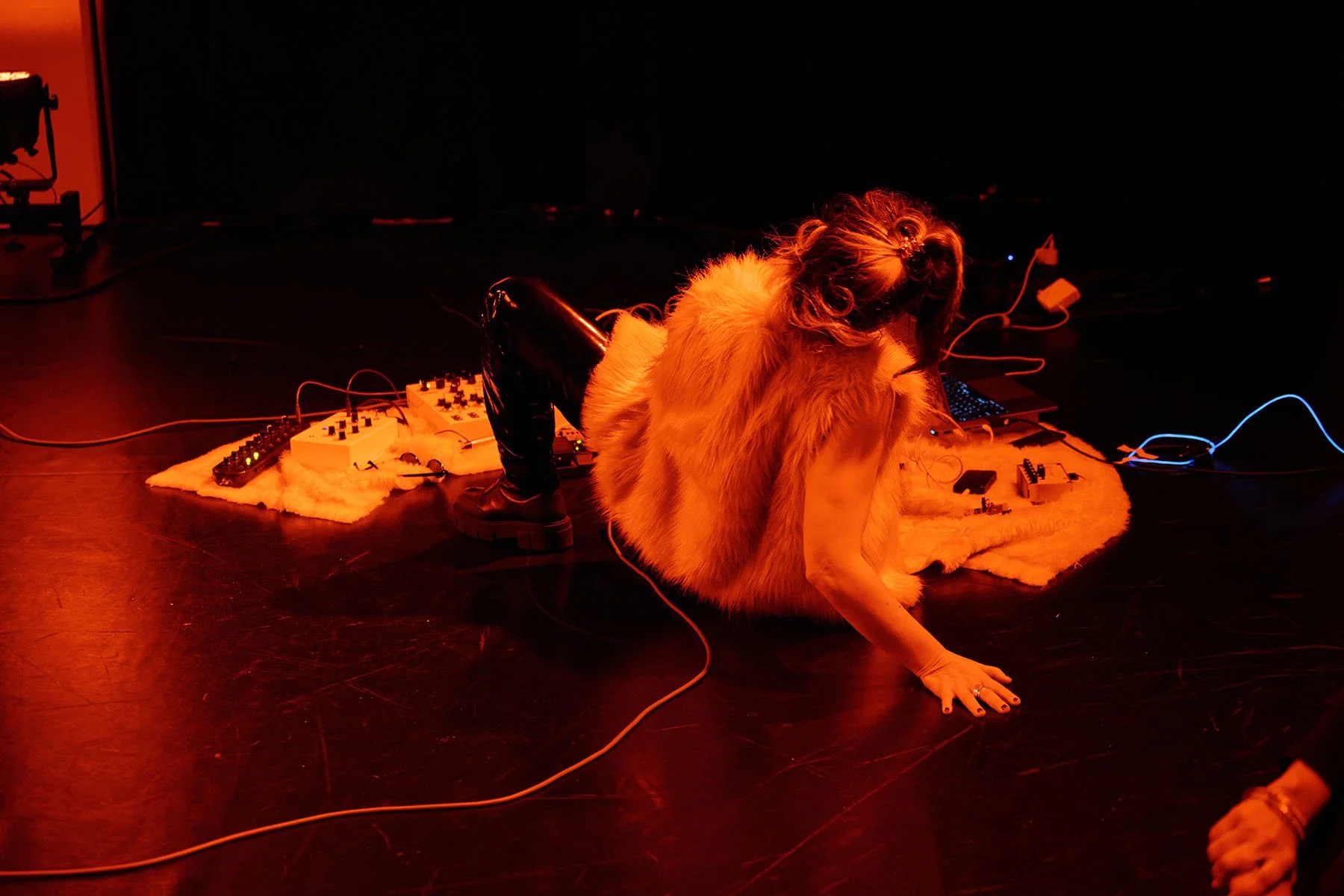 Composed for two simultaneous spaces—the binaural intimacy of radio transmission and the immersive field of the black box theater—the piece weaves spoken word, live electronics, inaudible frequencies, and the rhythmic dimensions of noise through the listener's body. This hybrid spatiality invites reconfigurations of the senses, spacetime, and his/tory, (un)worlding stories of a past to an anticipatory sense of listening.